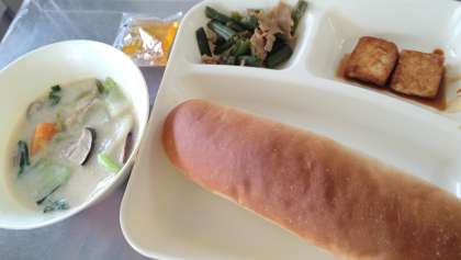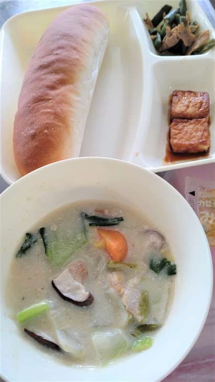 今日の給食は、はくさいのクリーム煮、あつあげのピリ辛じょうゆかけ、豚肉🐖とさんどまめのオイスターソースいため、コッペパン、みかん🍊ジャム、牛乳🥛です。