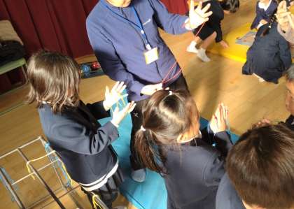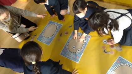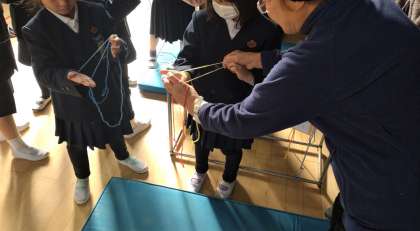 「あやとり」や「福笑い」も優しく教えてもらいました。初めてする遊びも多く、子どもたちは、老人会の方のお手本をしっかりと見て活動していました。