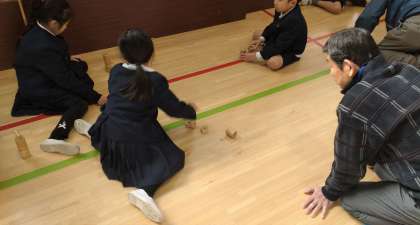 「だるま落とし」や「べったん」、「こま回し」も教えてもらいました。なかなか難しい昔遊びですが、子どもたちはとても一生懸命に取り組んでいました。