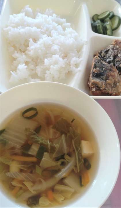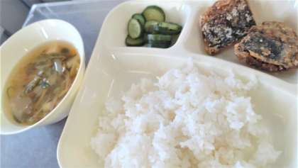 今日の給食は、さばのカレーたつたあげ、五目汁、きゅうり🥒の甘酢あえ、ごはん🍚、牛乳🥛です。
