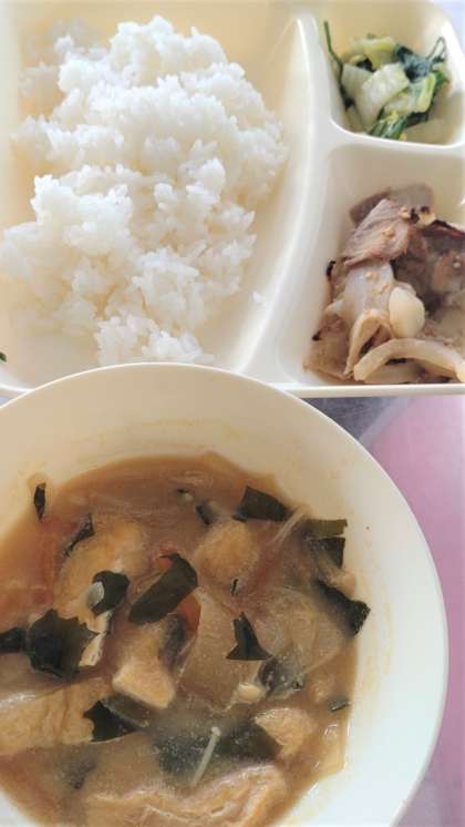 今日の給食は、豚肉🐖のごまだれ焼き、みそ汁、きくなとはくさいのおひたし、ごはん🍚、牛乳🥛です。
