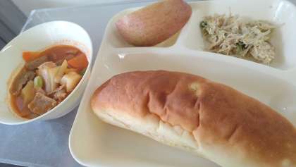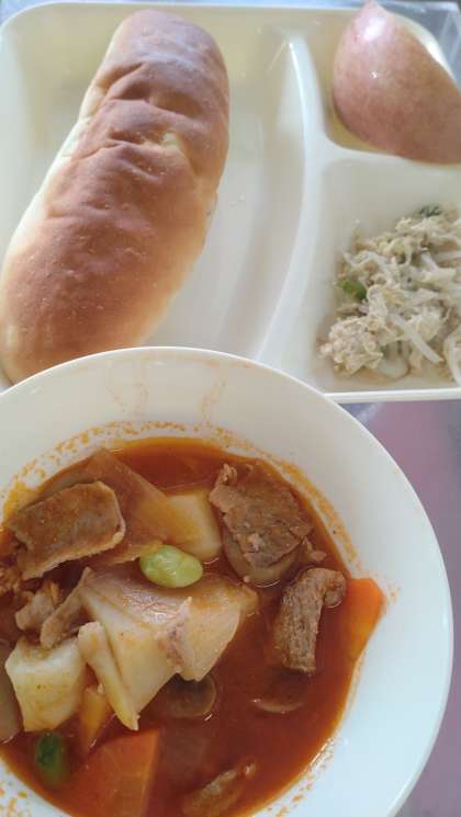 今日の給食は、ケチャップ煮、ささみと野菜🥬のソテー、りんご🍎、牛乳🥛です。
