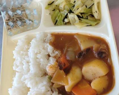 今日の給食は、ハヤシライス、キャベツとひじきのドレッシング、ミニフィッシュ🐟、牛乳🥛です。