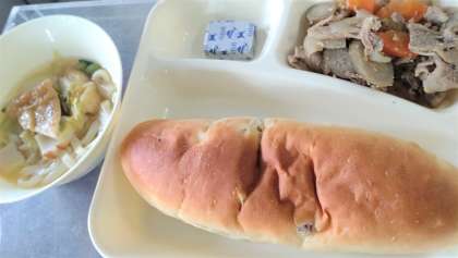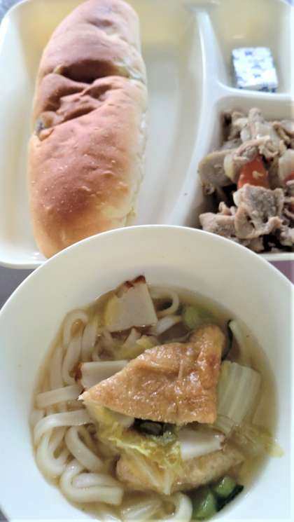 今日の給食は、豚肉🐖とごぼうの煮もの、なにわうどん、固形チーズ🧀、おさつパン🍞、牛乳🥛です。