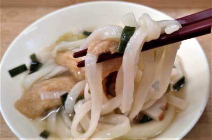 三角形に切って、甘辛く煮たうすあげ、かまぼこ、はくさい、青ねぎが入ったうどんにとろろこんぶを入れて食べます。