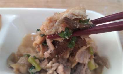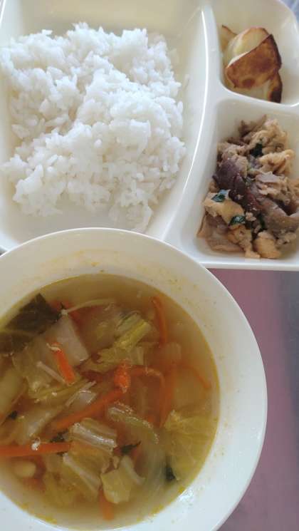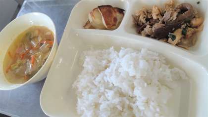 今日の給食は、豚肉🐖と干しずいきのみそ煮、五目汁、焼きじゃが🥔、ごはん🍚、牛乳🥛です。