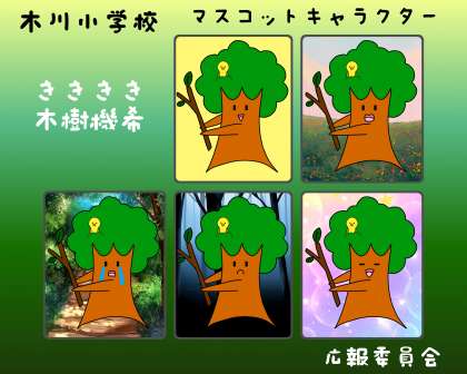 広報委員会で、木川小学校のマスコットキャラクターを募集し、たくさんの応募がありました。全校児童が投票し、6年生の作品「木樹機希(きききき)」が、木川小学校マスコットキャラクターに決まりました!