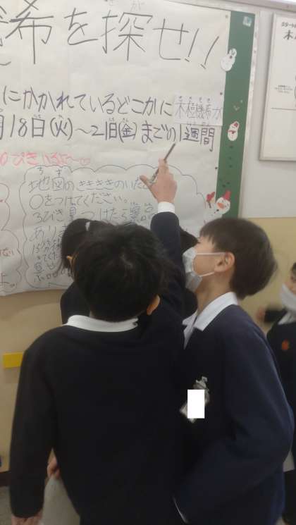 広報委員会の子どもたちが企画した、木川小学校マスコットキャラクターの『木樹機希(きききき)を探せ!』という取り組みが今日から始まりました。学校内に「木樹機希(きききき)」が隠れていて、それを発見するというイベントです。子どもたちは、休み時間にマスコットキャラクターを熱心に探していました。