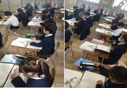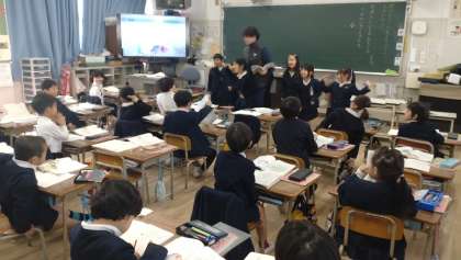 この授業では、グループでの発表の後、スイミーの気持ちを考えています。写真は、楽しくグループでの発表をしたり、ノートに自分の考えを書いたりしている子どもたちの様子です。