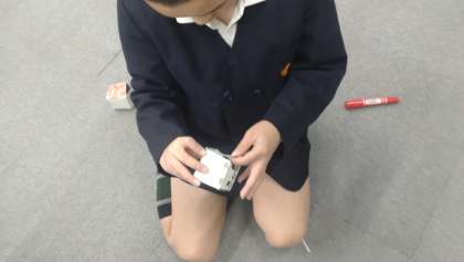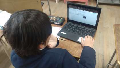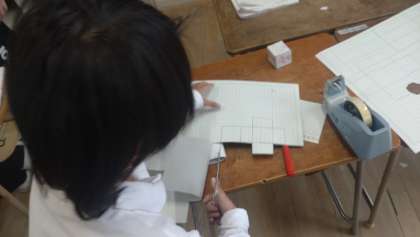 なかよし学級で、子どもたちがそれぞれの課題を熱心に取り組んでいます。算数では立方体づくり、国語では、漢字のアプリケーションソフトを使って学習しています。