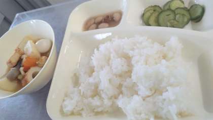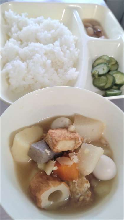 今日の給食は、関東煮、きゅうり🥒の梅風味、とら豆の煮もの、ごはん🍚、牛乳🥛です。