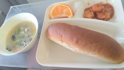 今日の給食は、えび🦐のチリソースいため、中華がゆ、デコポン🍊、黒糖パン、牛乳🥛です。