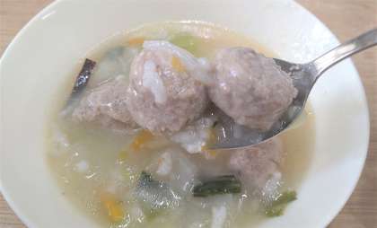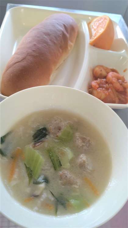 給食の中華がゆは、米のほかに肉だんご、チンゲンサイ、だいこん、にんじん🥕、しいたけが入っています。゛