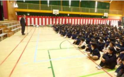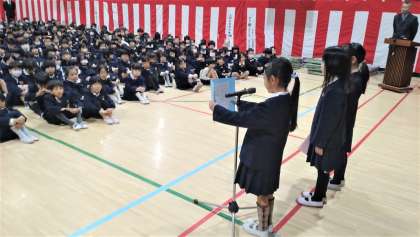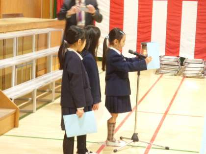 児童を代表して5年生の一人が修了証を校長先生から受け取りました。また、校長先生の話の後、1年生の3人が1年間の振り返りと来年度に頑張りたいことを発表しました。