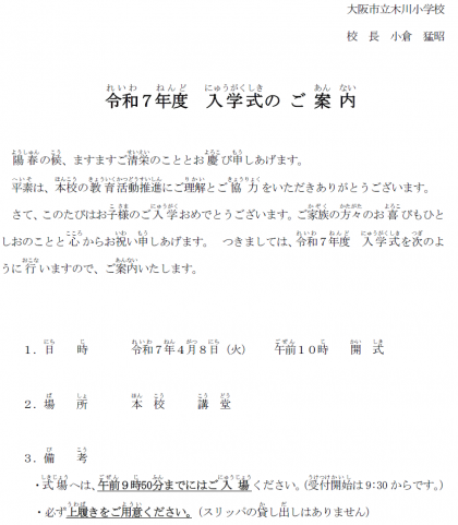 入学式につきまして、ご確認いただきますよう、よろしくお願いします。