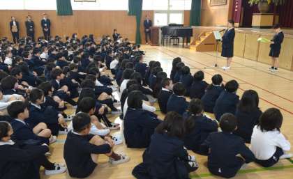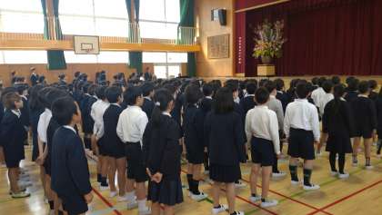 本日、令和七年度の始業式がありました。転入生や新しく来られた教職員の紹介、新担任の先生の発表などがありました。写真は、(上段)新学期のめあてを発表する6年生、(下段)校歌を歌う子どもたちの様子です。