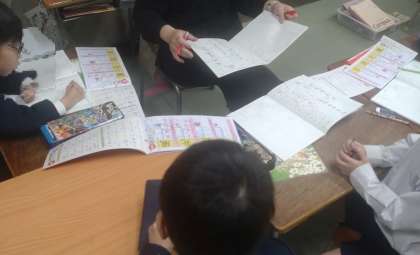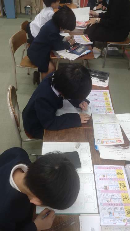 なかよし学級で子どもたちが漢字の学習に取り組んでいます。「風」や「元」などの新出漢字をドリルを活用して学んでいます。