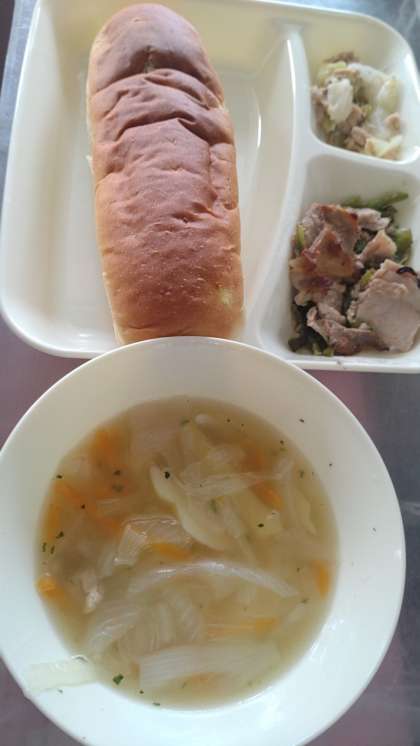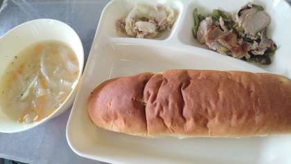 今日の給食は、豚肉🐖のガーリック焼き、スープ、ツナとキャベツのソテー、おさつパン🍞、牛乳🥛です。