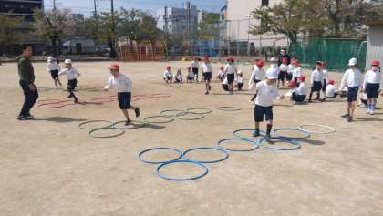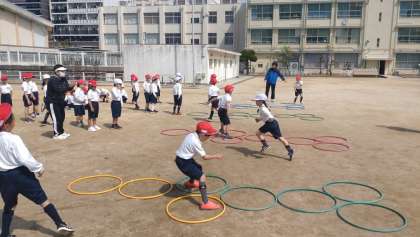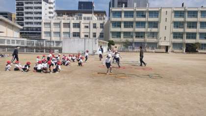 2年生が「体つくり運動」に取り組んでいます。体を移動する運動遊びで元気に運動しています。