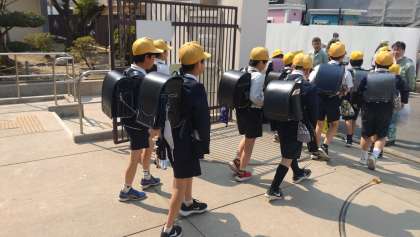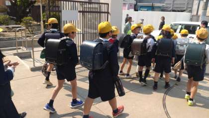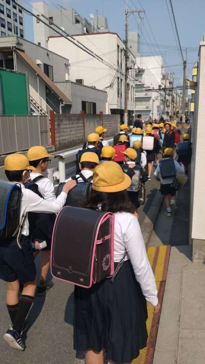 今日の5限目に地域子ども会がありました。同じ地域の子どもたちが集まって自己紹介や下校時の注意などの確認をしました。写真は、集団下校をする子どもたちの様子です。高学年の班長がリードして下校しています。