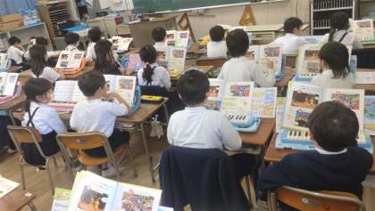 2年生が鍵盤ハーモニカ演奏と鑑賞学習に取り組みました。鑑賞学習では、「いろいろな くにの おどりの 音楽を楽しみましょう。」というテーマで、ティニクリン/エース オブ ダイヤモンド/とーしん ドーイ♪ドードレブスカ ポルカなどの曲を鑑賞しました。