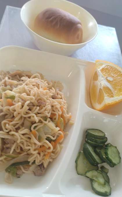 今日の給食は、焼きそば、きゅうり🥒のしょうがづけ、あまなつかん🍊、ミニコッペパン、牛乳🥛です。