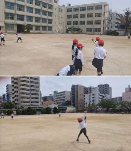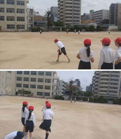 3年生がボールを使った「体つくり運動」に取り組んでいます。フォームを工夫しながらボールを投げています。