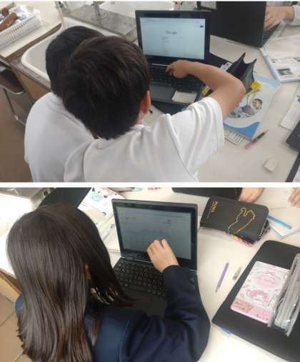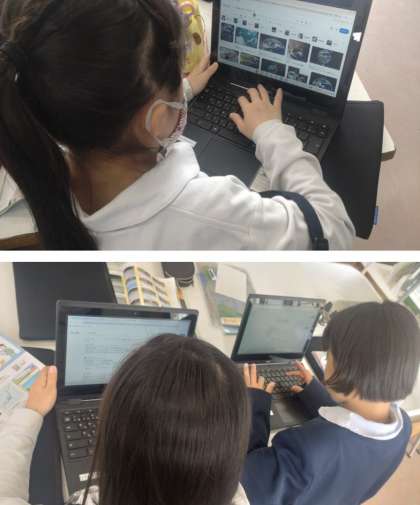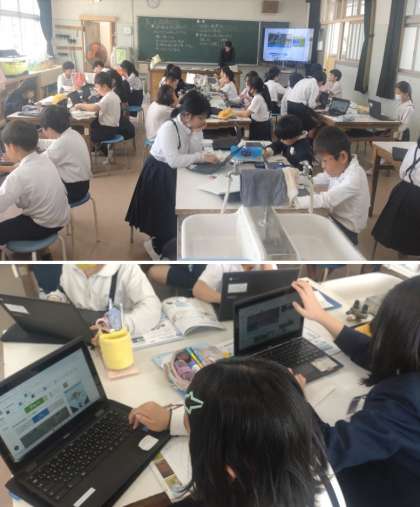 5年生の理科で「雲と天気の変化」の学習に取り組んでいます。この時間は、「天気の変化のきまり」について学習しています。写真は、インターネットで雲画像やアメダスなど気象情報を収集している子どもたちの様子です。