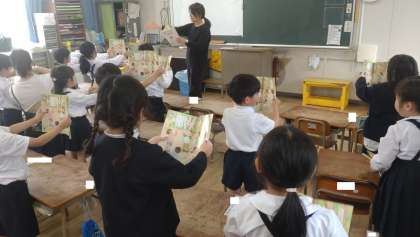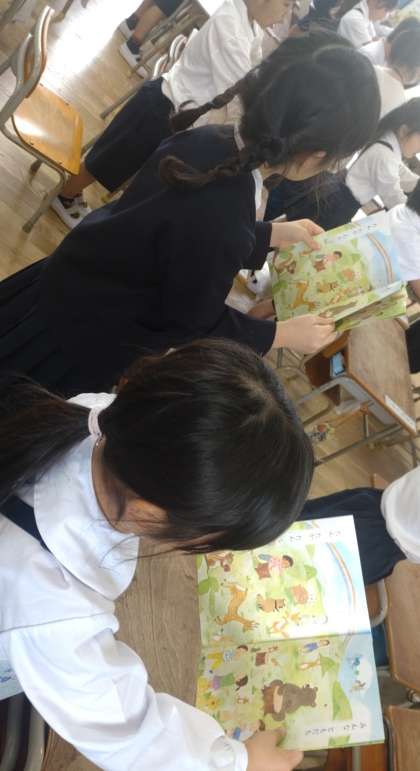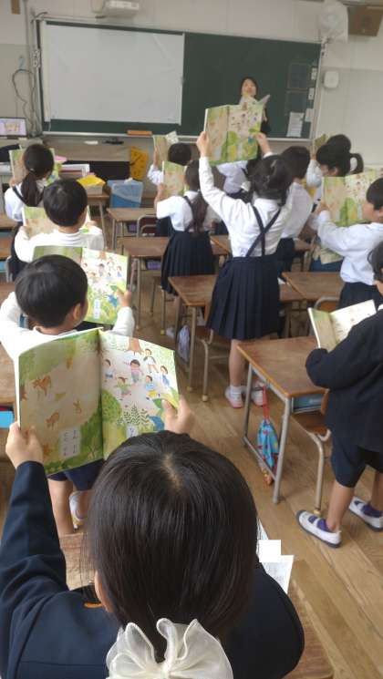 1年生が国語で音読の学習に取り組んでいます。教科書をしっかりと持って、よい姿勢で音読しています。
