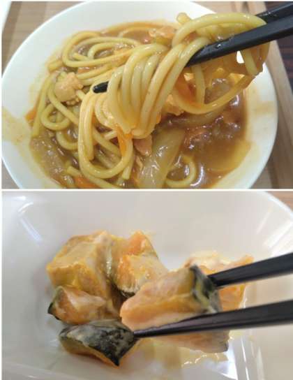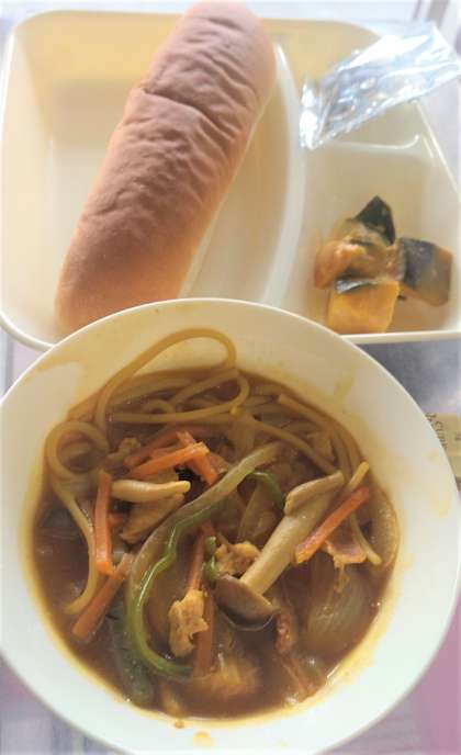 今日の給食は、カレースープスパゲッティ、かぼちゃのマリネ焼き、ミニフィッシュ🐟、コッペパン、牛乳🥛です。