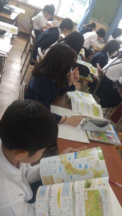 5年生が社会で「国土のさまざまな地形」について学習しています。地図帳を活用して、山脈、高地、平野など様々な地形を調べています。