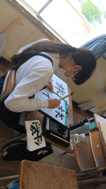 6年生が、書写で毛筆に取り組んでいます。毛筆で「旅行」を書きました。点画のつながりに気を付けて書いています。