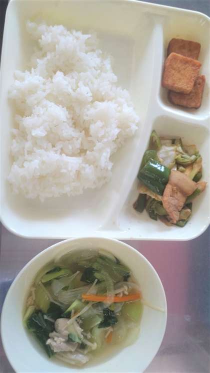 今日の給食は、ホイコウロー、中華スープ、あつあげのピリ辛じょうゆかけ、ごはん🍚、牛乳🥛です。
