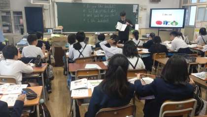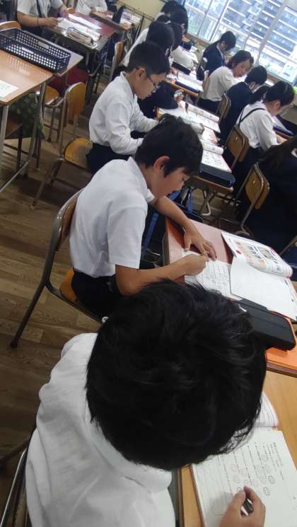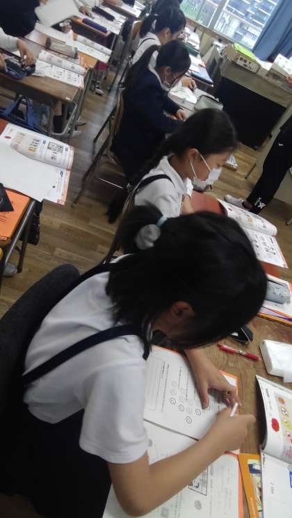 5年生が英語の学習に取り組んでいます。What ... do you like?の表現で好きなものをたずね合う学習です。写真は、子どもたちが、音声を聞いて、聞こえたアルファベットの大文字を鉛筆でなぞっている様子です。