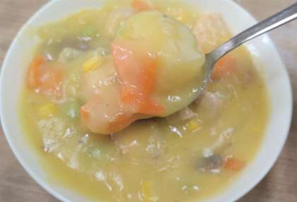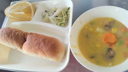 今日の給食は、鶏肉🐣とコーン🌽のシチュー、キャベツのひじきドレッシング、かわちばんかん、おさつパン、牛乳です。
