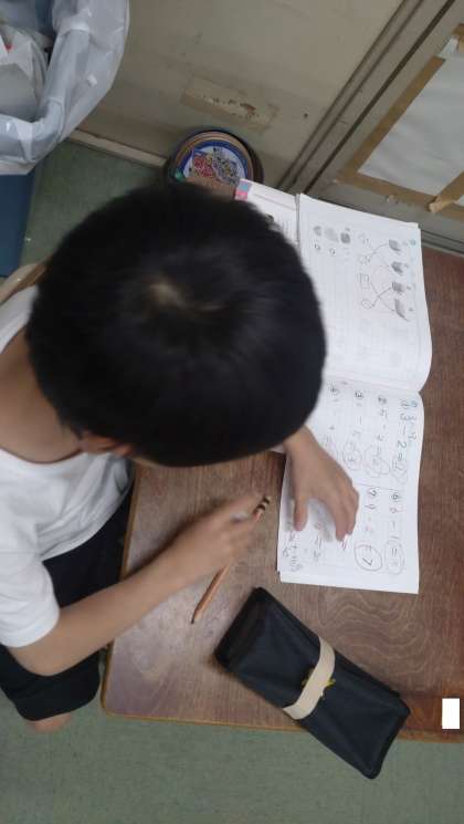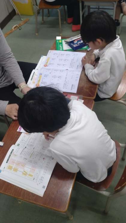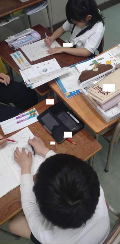 なかよし学級で、算数の学習に取り組んでいます。繰り下がりのあるひき算など、それぞれの課題に向けて、先生の支援のもと集中して学習しています。