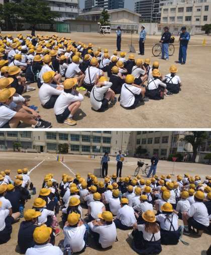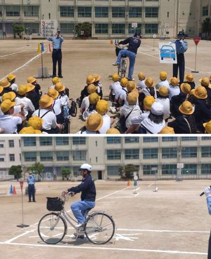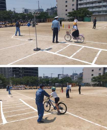 3限目に4,5,6年生が交通安全の学習をしました。高学年は、自転車の安全な乗り方を2限目に引き続き、淀川警察、セーフティよどがわの方より指導していただきました。最初に、自転車の点検の仕方や乗り降りの注意点などを教えていただきました。その後、見本走行と代表の子どもたちが実際に自転車で安全な走行について体験しました。