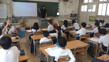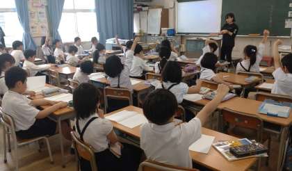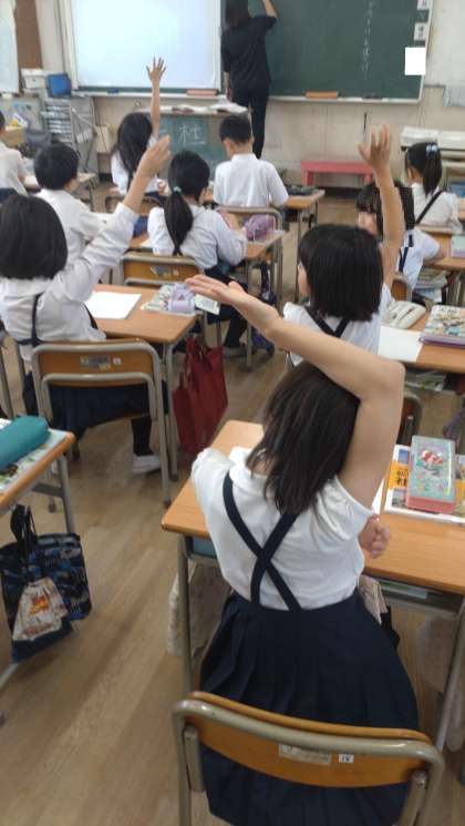3年生が社会で大阪市の様子について学習しています。この学習は、大阪府内における市の位置や市の地形や土地利用、交通、主な公共施設の場所と働き、古くから残る建造物の分布など、地図などの資料を使ったりして調べ、まとめることで市の様子をとらえることが目標になります。写真は、子どもたちが積極的に授業で発表している様子です。