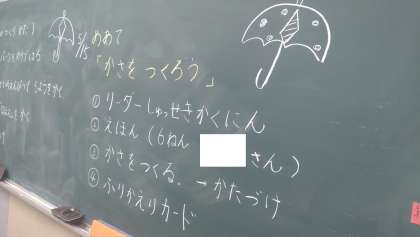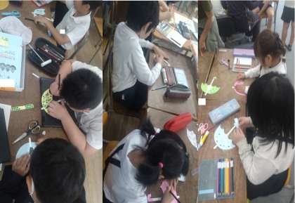木曜日の2限目は「なかよしタイム」です。今回は、絵本の読み聞かせの後、みんなでお手本を見ながら、「かさ」を作りました。色鉛筆やシールを使って自分なりにイメージした「かさ」を作っていきました。