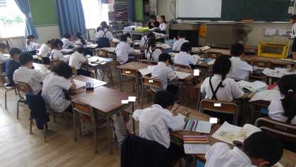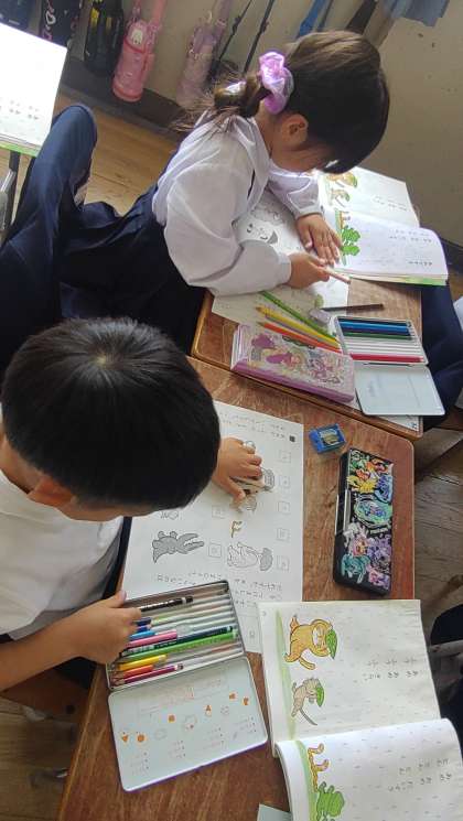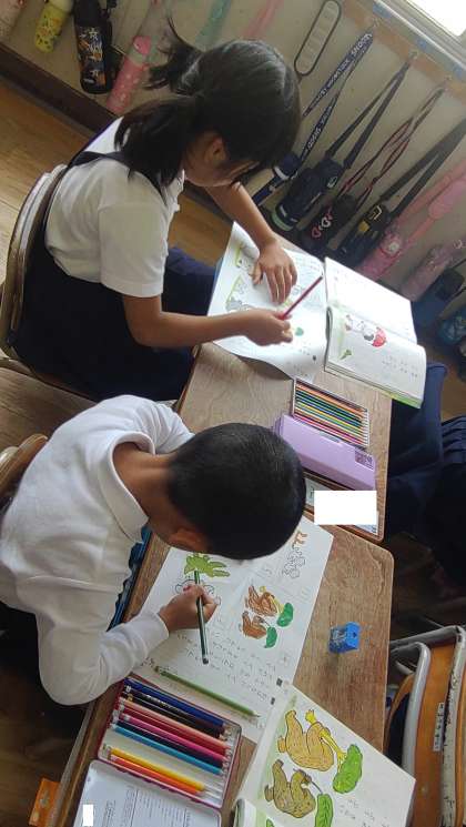 1年生が国語で詩の学習に取り組んでいます。教材「あめ」で、絵と言葉を結び付けて、場面や人物の様子を思い浮かべて音読を楽しむ学習です。写真は、子どもたちが、プリントを使って学習している様子です。