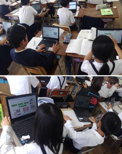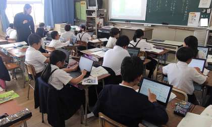 4年生が国語で単元『わたしのクラスの「生き物図かん」』の学習に取り組んでいます。好きな生き物を選び、材料を集めて、リーフレットを作る学習です。子どもたちはタブレットを活用して調べて、段落どうしのまとまりを考えながらリーフレットを作っています。