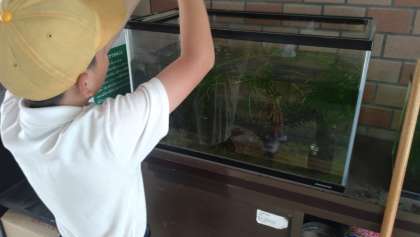 今朝も子どもたちは元気に登校しています。下段の写真は、朝、玄関くで、清掃や生き物の世話をする子どもたちの様子です。