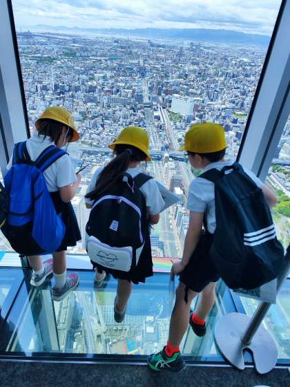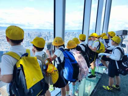3年生が社会見学であべのハルカスに行きました。大阪市の土地や建物の様子をあべのハルカスの展望台より観察しました。