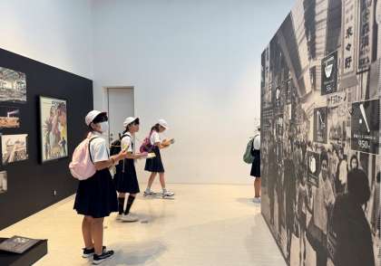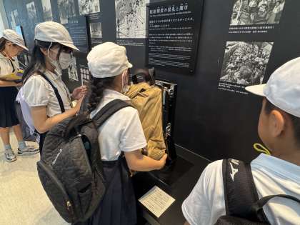 写真は、ピース大阪にて、戦後、GHQによる占領下から高度経済成長を経て発展する大阪の姿を見学してる様子です。農村へ買い出しに出かけたときの重さを体験するリュックも持ってみました。