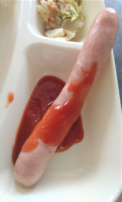今日の給食では、ゆでたウインナーソーセージにケチャップ味のソースをかけています。
