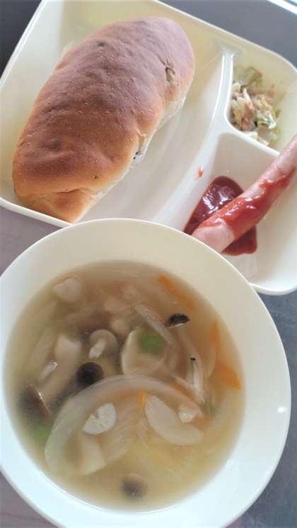 今日の給食は、ウインナーのケチャップソース、スープ、焼きツナキャベツ、レーズンパン、牛乳🥛です。