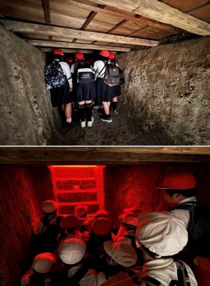 子どもたちは、大阪空襲について、当時の写真や絵、実物資料などを見学して調べ考えました。防空壕の体験もしました。