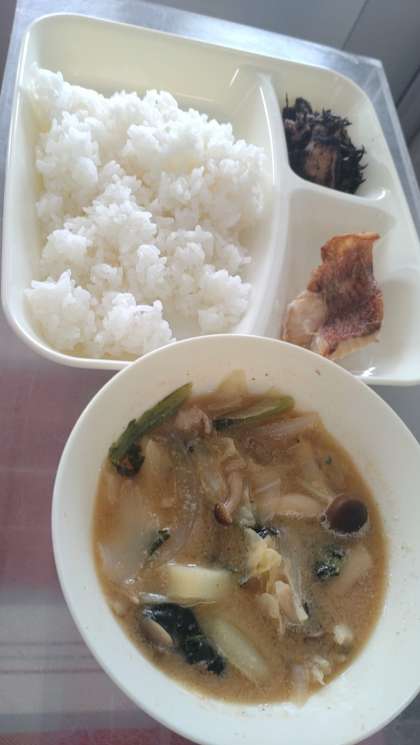 今日の給食は、あかうおのしょうゆだれかけ、みそ汁、ひじきのいため煮、ごはん🍚、牛乳🥛です。