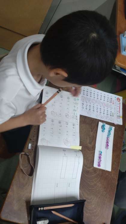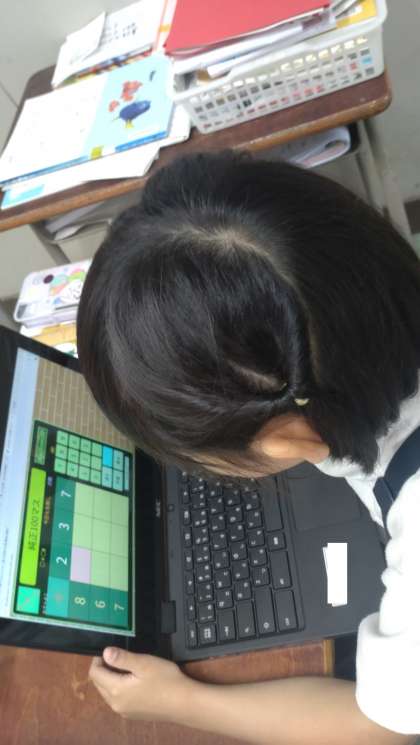 なかよし学級で算数の学習に取り組んでいます。繰り上がりのあるたし算やタブレットを活用しての百マス計算などそれぞれの課題に熱心に取り組んでいます。