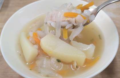 今日の給食は、かつおのガーリックマリネ焼き、押麦のスープ、グリーンアスパラガスのソテー、黒糖パン、牛乳🥛です。